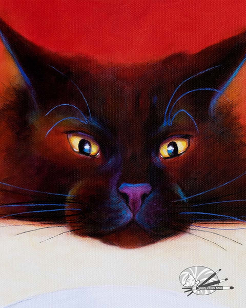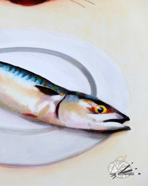 Just a Little Snack? Meet the most handsome (and hopeful) cat in the room! This is a fun, lively painting of a black cat caught in a moment of pure temptation. He's sitting by the dining table, eyes locked in a desperate, hungry stare at the perfect fish dinner.