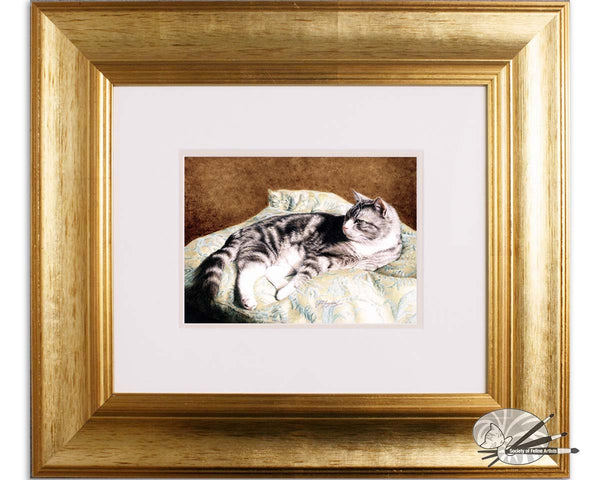 Painting this sweet little silver tabby cat was a joy! It's exciting to paint interesting fur, and this cat certainly has wonderful markings. This cat loves lazing around on her luxurious cushion - what a splendid life!