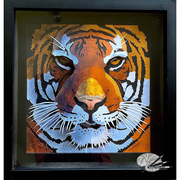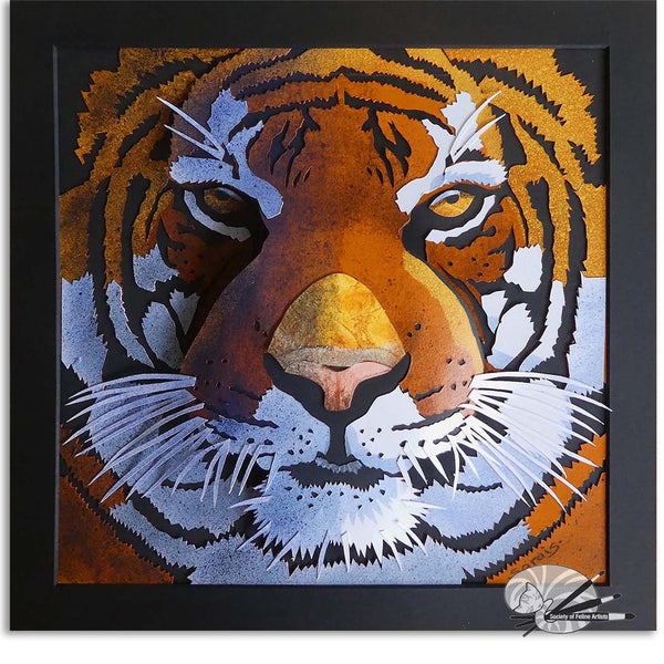 3D Papercut of Tiger’s face, moulded and cut in painted papers.