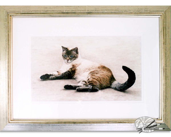Partway through having a relaxed wash, 'Tosca' was distracted and took a moment's interlude. This is a typical pose where the blended tail is flicked up in the air, the ears are forward, intently listening with her body and legs completely relaxed, which makes for an interesting composition. I have observed and painted this friendly little Siamese/Persian cat many times, as I adore depicting the beautiful blue eyes and stunning fur markings.