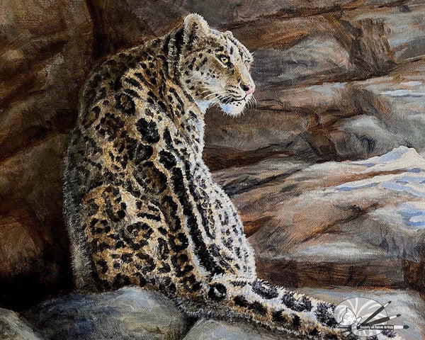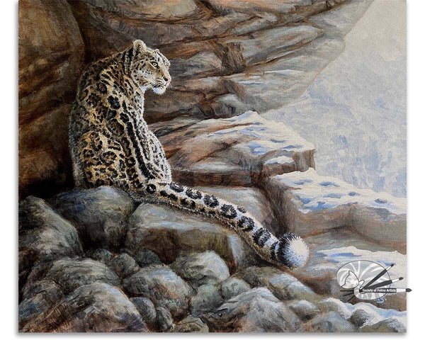 Snow Leopard looking out from a rocky cave to a snowy landscape.