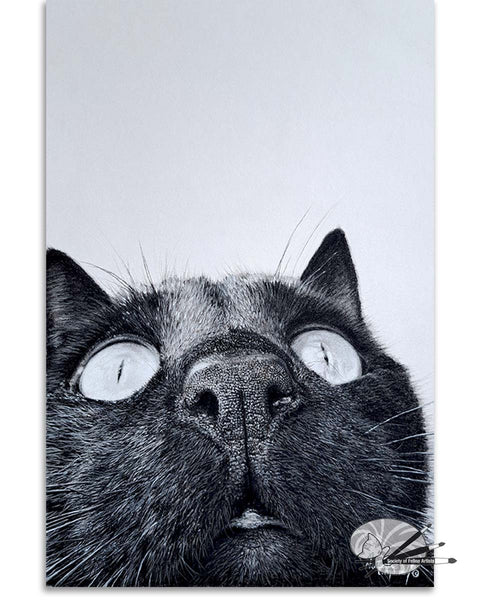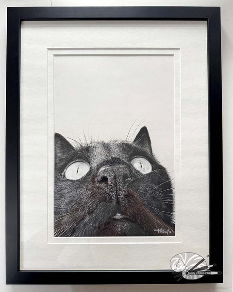'Close-up!' is an original pastel and charcoal drawing of our black panther Abui. He is into everything, super curious and inquisitive, and he always knew when I was trying to take pics of him. Where Mina would be camera shy, Abui was bold, going right up to the camera whilst smelling it, getting his close-up! Lol. Which was lucky for me, as his close-up created a very different pose that I have been wanting to draw and so I got excited when I heard about SOFA's new online exhibition in October, I finally got the opportunity to complete it and include in the show. I loved drawing all that lovely detail in his cute nose.