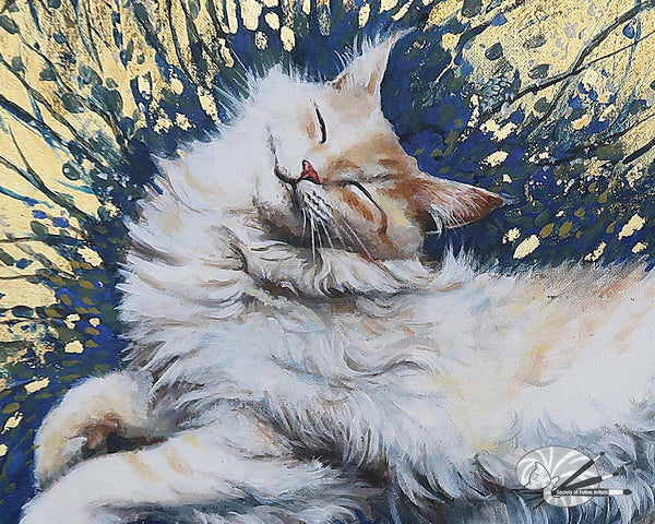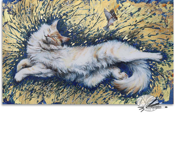 This pale gold and oil painting features an exuberant smiling cat, leaping happily into Spring life. A House Sparrow is seen escaping the blissful cats grasp. Gold, cream and dark blue colors.
