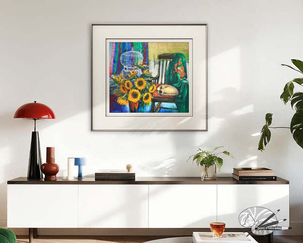 This still life painting was inspired by my cat making himself comfortable by sitting on the chair. I was setting up this still life. I think he liked the feel of the silk of the Green Kimono. I then added the Bird Cage to the composition.